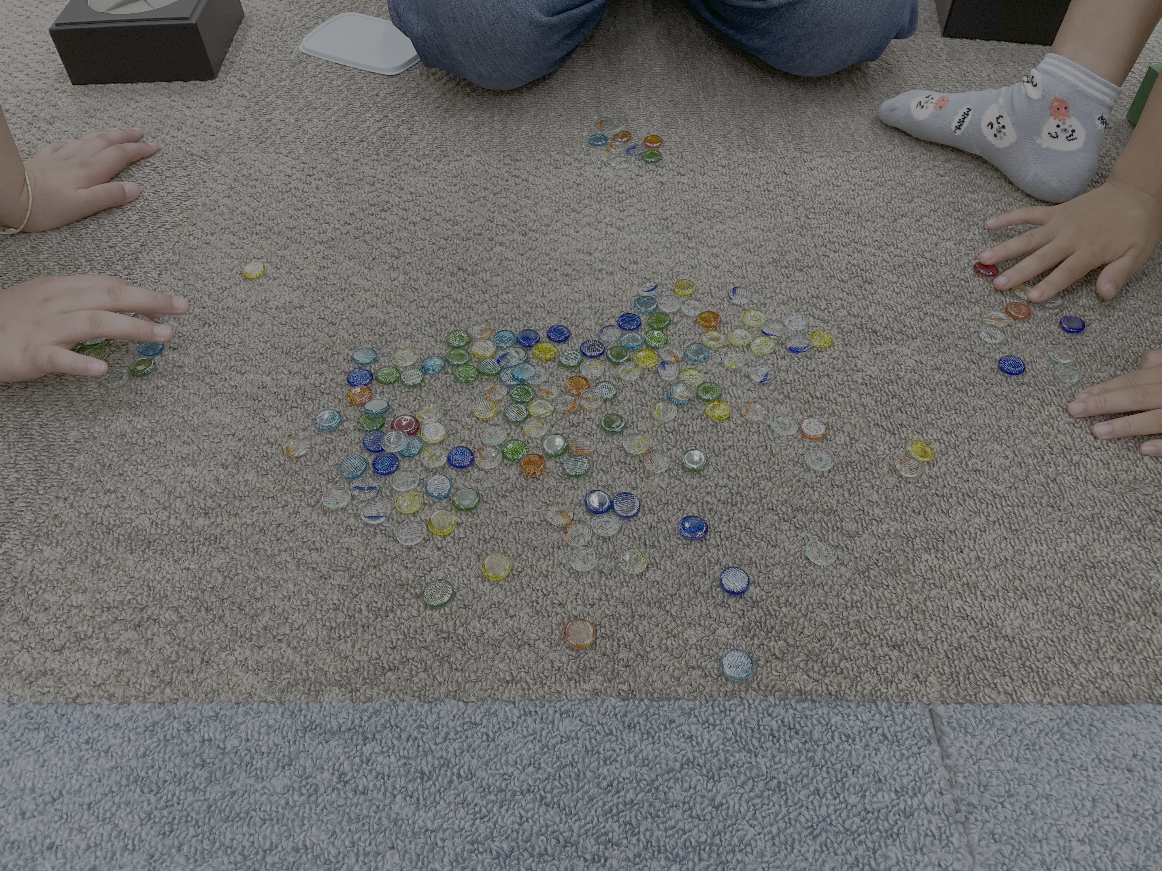下の写真のようにおはじきを床にばらばらっと広げて、スタッフが出す「ことばの指示」に合わせて、子どもたちにおはじきを取ってもらいます。