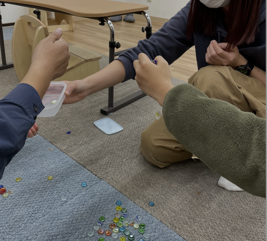 おはじきを入れるケースをあえて動かして、狙いを定めておはじきを少しずつ入れるようにお願いしたり。